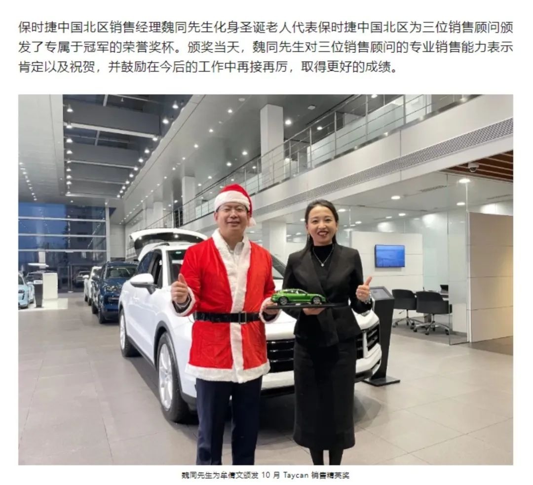 半岛都市报报道,1月24日,记者联系到了这位销售顾问,加入保时捷品牌6年,她表示自己非常满意这个销售数字,回忆起6年前自己卖出的第一台保时捷,她当时非常兴奋,“那是一台卡宴,被一位年轻的女士买走,价值100万元左右。”