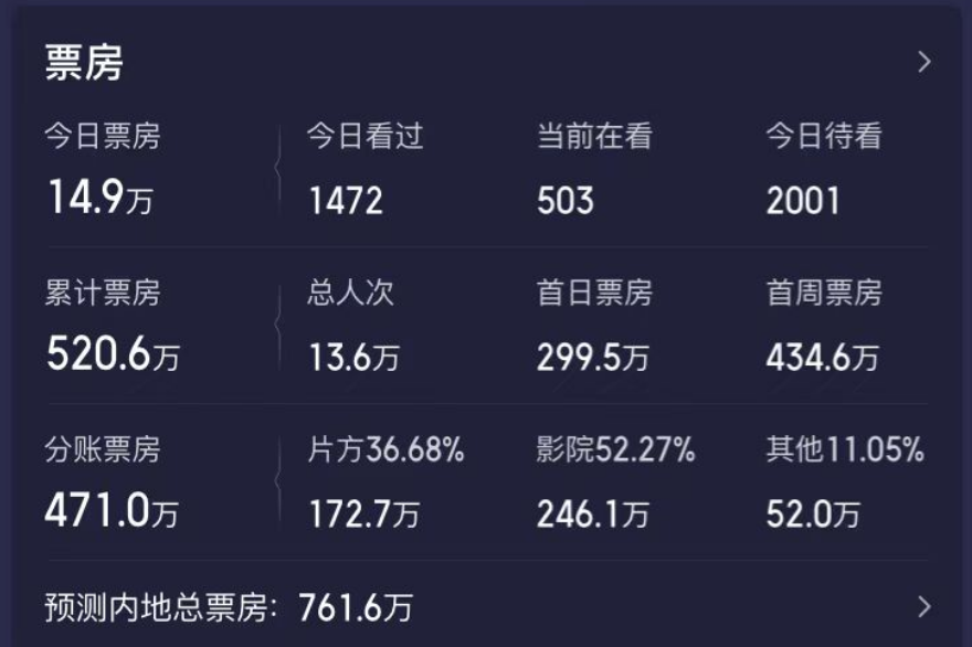 不过,影片于1月20日上映后票房并不理想,据猫眼电影专业,前4天该片票房总计505万元,截至1月24日16时,影片票房520万元,而预测内地总票房仅为761.6万元。
