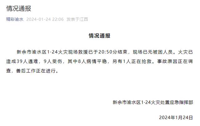 1月24日,新余市渝水区1·24火灾处置应急指挥部发布情况通报,新余市渝水区1·24火灾现场救援已于20:50分结束,现场已无被困人员。火灾已造成39人遇难,9人受伤,其中8人病情平稳,另有1人正在抢救。事故原因正在调查,善后工作正在进行。