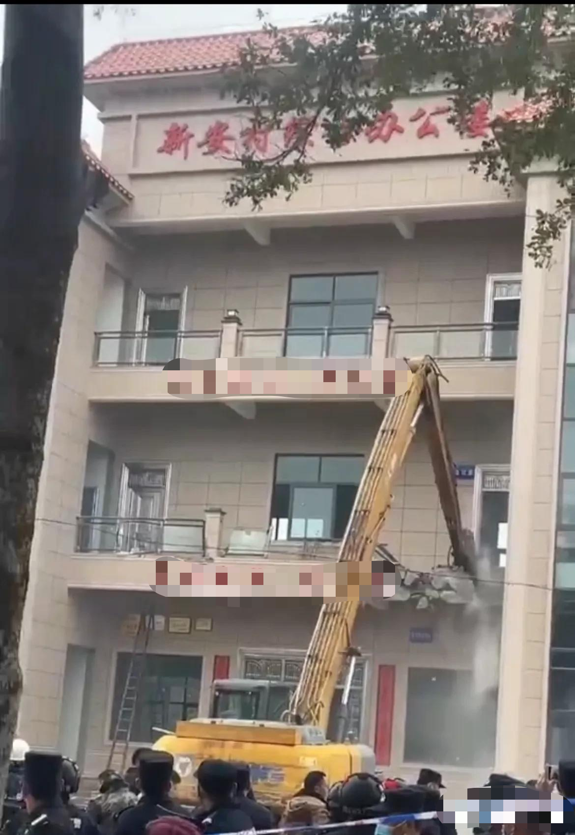 网传视频显示,一栋写有新安村综合办公室的三层小楼,正在被拆除。现场拉着警戒线,三台挖掘机正在轰隆隆地作业。
