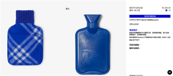 从巴宝莉官网了解到,这些热水袋售价从3300元—4400元不等,除热水袋本身以外,还配有一个用挪威精纺羊毛面料打造的套袋,装饰格纹图案,每款热水袋套袋都有自己的设计元素。