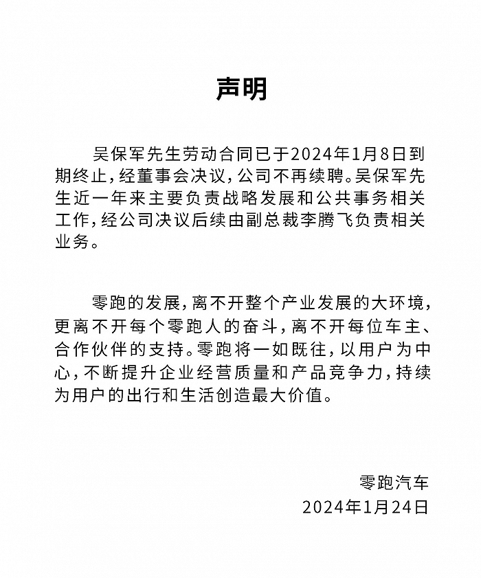 1月24日,零跑汽车发布声明称,吴保军劳动合同已于2024年1月8日到期终止,经董事会决议,公司不再续聘。吴保军近一年来主要负责战略发展和公共事务相关工作,经公司决议后续由副总裁李腾飞负责相关业务。