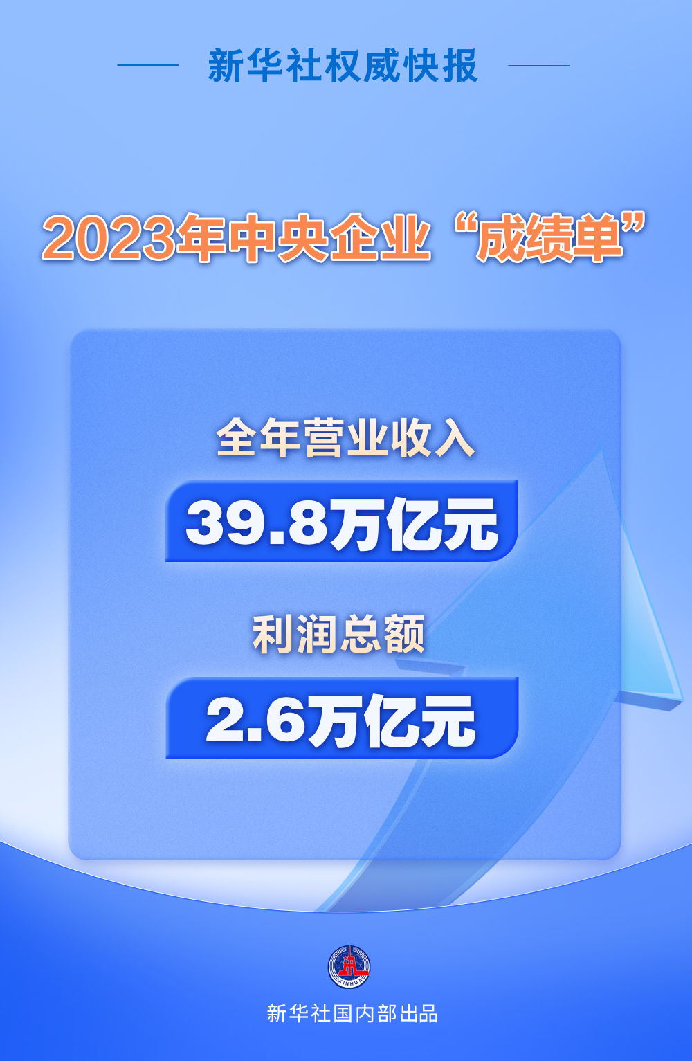 国务院国资委1月24日发布年度中央企业运行“成绩单”:2023年,中央企业实现营业收入39.8万亿元、利润总额2.6万亿元、归母净利润1.1万亿元,实现高质量的稳步增长;累计完成固定资产投资(含房地产)5.09万亿元、同比增长11.4%,战略性新兴产业完成投资2.18万亿元、同比增长32.1%;中央企业研发经费投入1.1万亿元,连续两年突破万亿元大关。