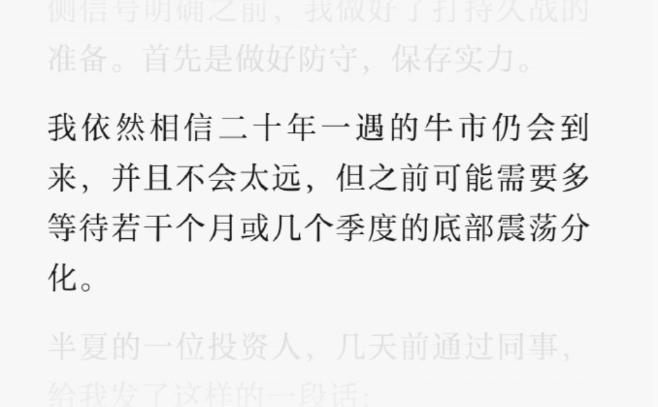 “我依然相信二十年一遇的牛市仍会到来,并且不会太远,但之前可能需要多等待若干个月或几个季度的底部震荡分化。”李蓓写道。