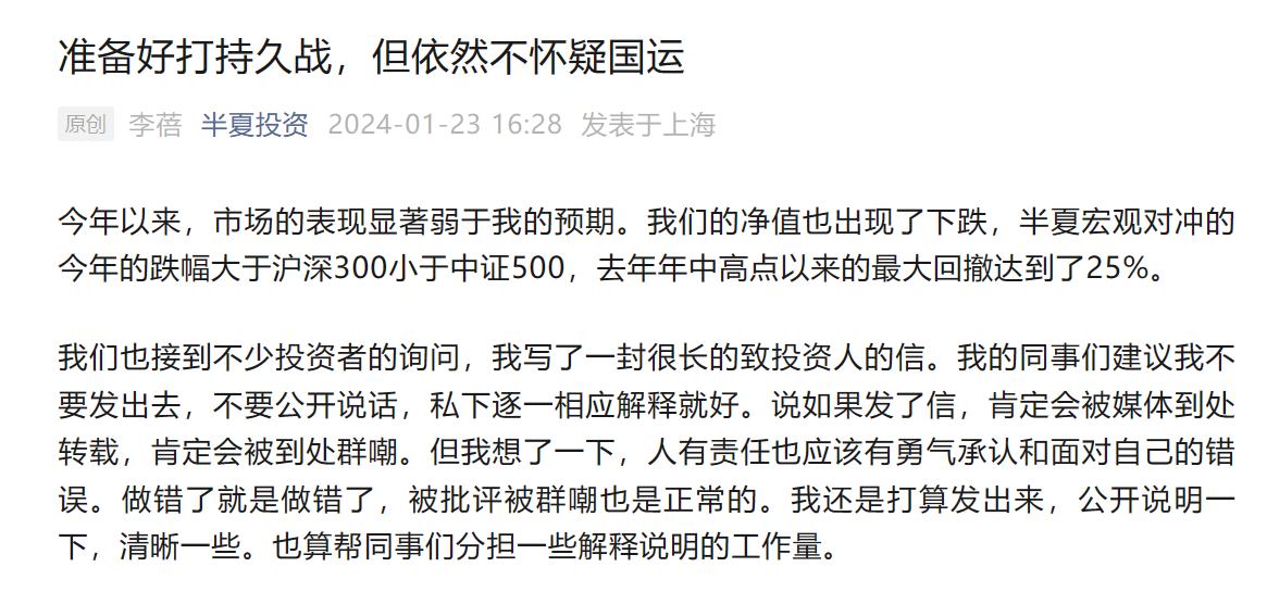 1月23日,半夏投资微信号发布《准备好打持久战,但依然不怀疑国运》一文,“私募小魔女”半夏投资李蓓表示,半夏宏观对冲的今年的跌幅大于沪深300小于中证500,去年年中高点以来的最大回撤达到了25%。