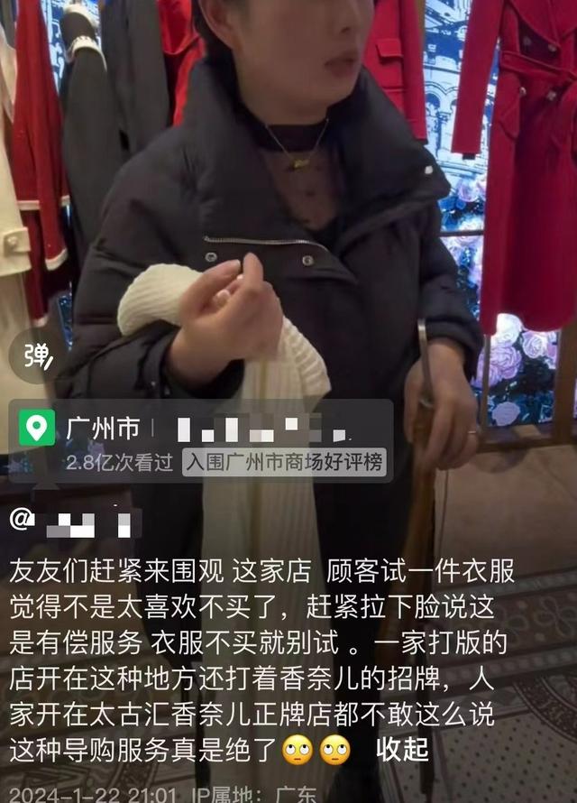 视频发布于1月22日晚,画面中一女店员一手拿着衣架,一手架着衣服称“要是早知道你不喜欢就不用你试了,我们公司有规定的,毕竟价位在这里,3000块钱,万一磕了碰了(就不好了)。”