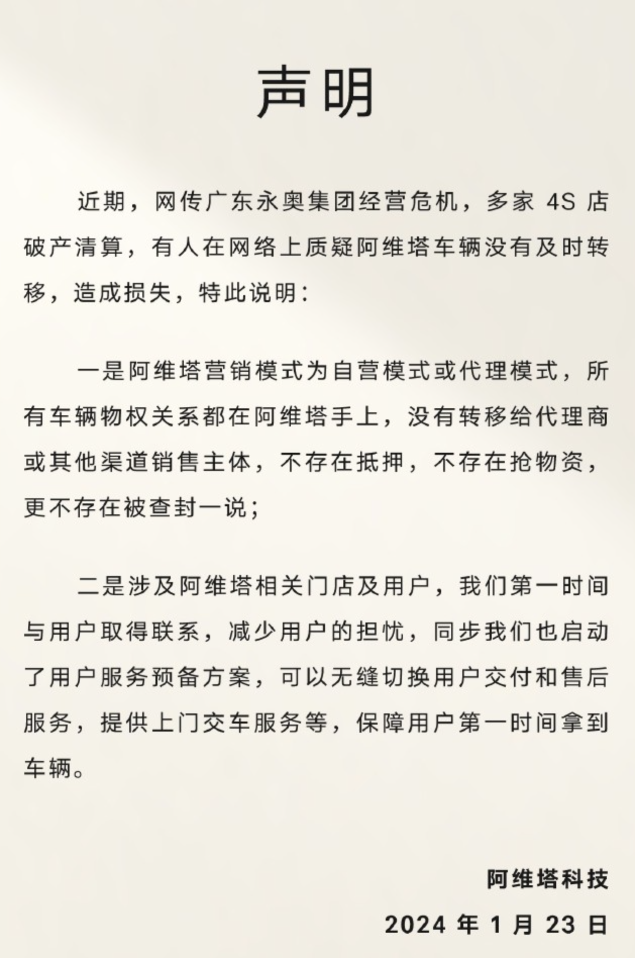 1月23日,阿维塔官方微博发布声明,回应近期网传的4S店相关问题。阿维塔称,其营销模式为自营模式或代理模式,所有车辆物权关系都在阿维塔手上,没有转移给代理商或其他渠道销售主体,不存在抵押,不存在抢物资,更不存在被查封一说。