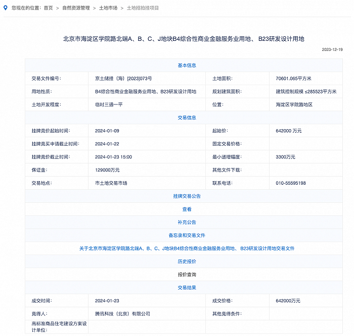 据北京市规自委网站,1月23日,腾讯科技(北京)有限公司以底价摘得海淀区学院路北端A、B、C、J地块B4综合性商业金融服务业用地、 B23研发设计用地,成交金额64.2亿元。据悉,此次并非腾讯在北京首次拿地,其于早年间曾拿下海淀区西北旺东路10号地块,目前已建成腾讯北京总部大楼。