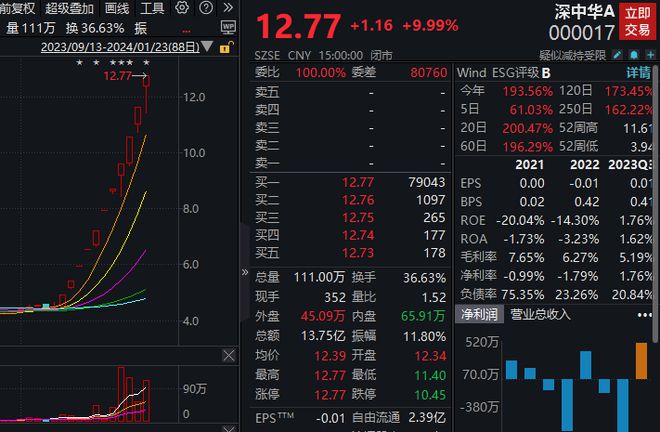 盘面上,深中华A今日再度涨停,录得11连板,报12.77元,期间累计涨185%。