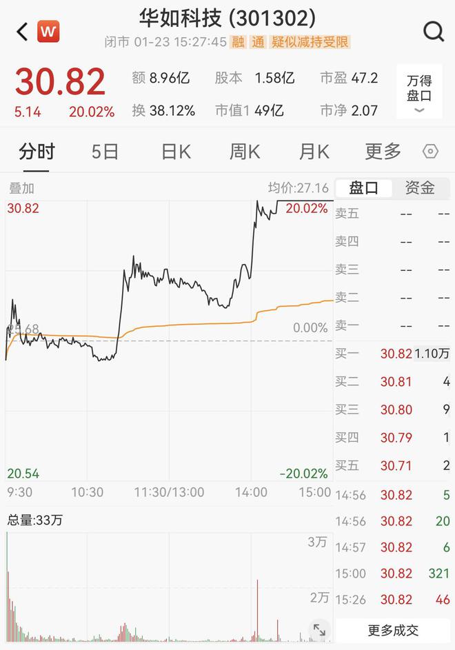 1月22日、1月23日两个交易日,华如科技连续20%涨停,累计涨幅超44%。截至1月23日收盘,华如科技报30.82元/股,总市值49亿元。
