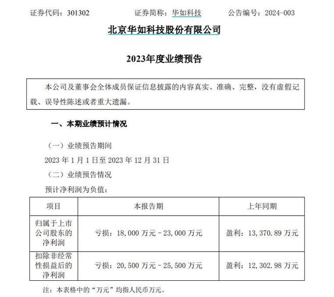 1月23日晚间,连续两个交易日20%涨停的华如科技公告,预计2023年归属于上市公司股东的净利润亏损1.8亿元-2.3亿元,上年同期则盈利1.34亿元。
