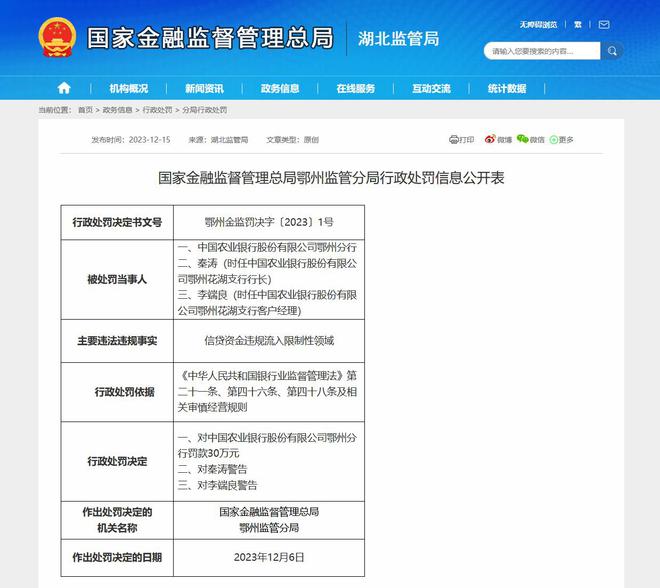 国家金融监督管理总局鄂州监管分局行政处罚信息公开表显示,中国农业银行股份有限公司鄂州分行因信贷资金违规流入限制性领域,被罚款30万元。