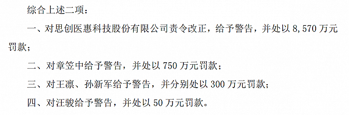 浙江证监局对思创医惠及相关人员的罚款情况,图源:公司公告