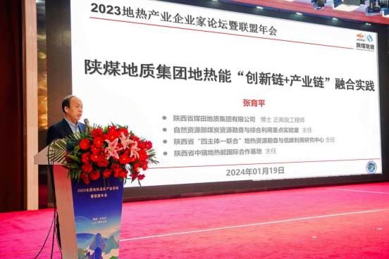 会上,陕西省煤田地质集团有限公司重点实验室主任、省“四主体一联合”地热能校企联合研究中心主任张育平博士作了题为《陕煤地质集团地热能“创新链+产业链”融合实践》的主旨报告,对陕煤地质集团近年来在地热能方面取得的科研成果和产业应用情况作了系统介绍,并在论坛上首次推出了陕煤地质集团地热能开发利用的“眉县模式”。