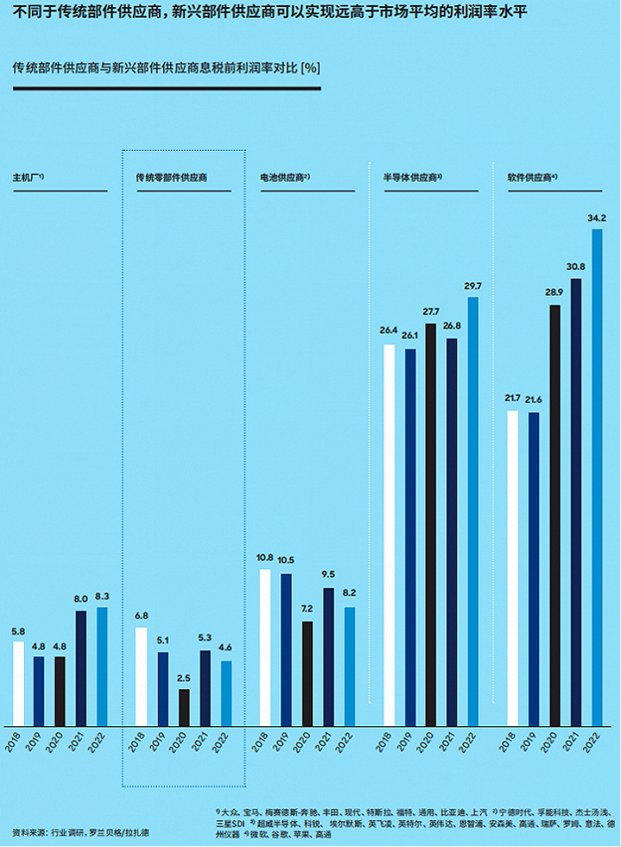 罗兰贝格的一篇研究报告显示,2018年至2020年,传统零部件供应商的息税前利润率分别为6.8%、5.1%、2.5%,电池供应商的息税前利润率则分别为10.8%、10.5%、7.2%,几乎是前者的两倍,而来自汽车领域外的软件供应商,利润率甚至是传统零部件厂商的四倍多。