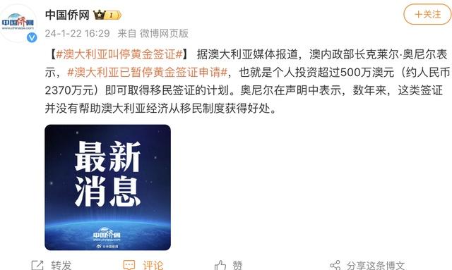 据澳大利亚媒体报道,澳内政部长克莱尔·奥尼尔表示,澳大利亚已暂停黄金签证申请,也就是个人投资超过500万澳元(约人民币2370万元)即可取得移民签证的计划。奥尼尔在声明中表示,数年来,这类签证并没有帮助澳大利亚经济从移民制度获得好处。