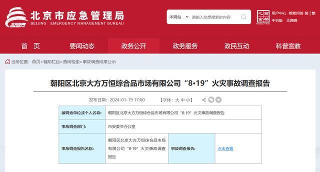 近日,北京市应急管理局网站发布《朝阳区北京大方万恒综合品市场有限公司“8·19”火灾事故调查报告》。