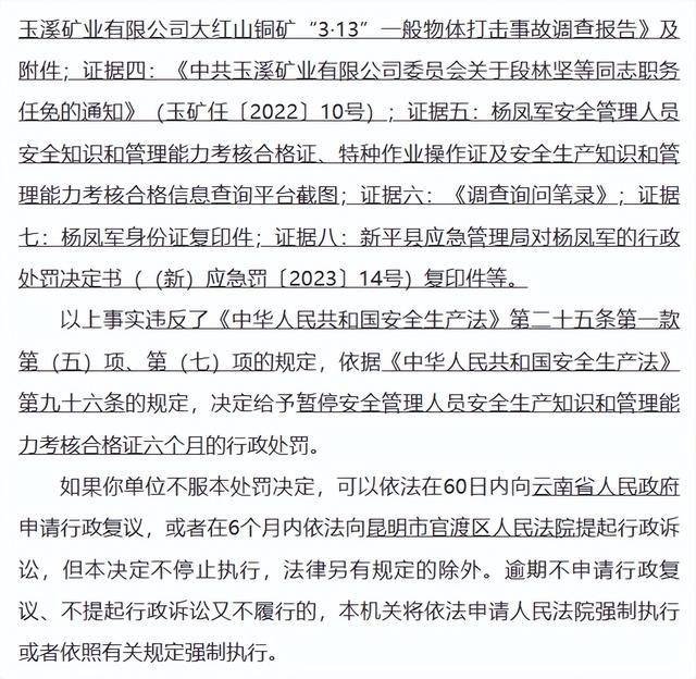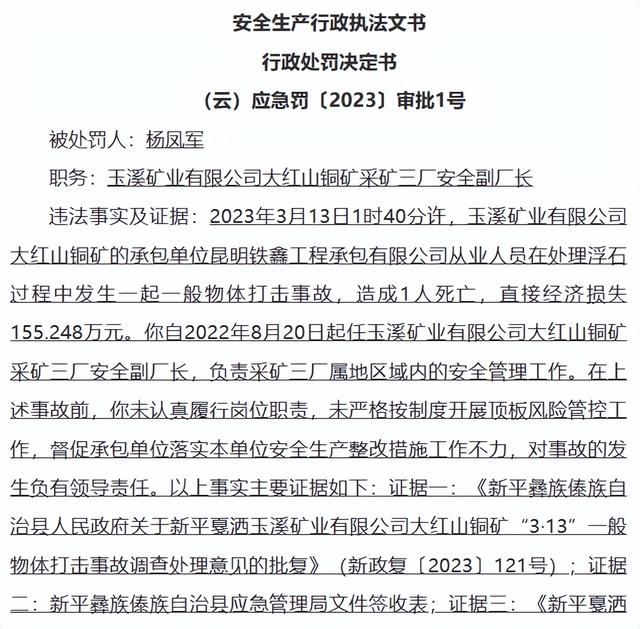 据云南省应急管理厅网站消息,云南省应急管理厅网站近日公布的《安全生产行政执法文书行政处罚决定书(云)应急罚〔2023〕审批1号》显示,2023年3月13日1时40分许,玉溪矿业有限公司大红山铜矿的承包单位昆明铁鑫工程承包有限公司从业人员在处理浮石过程中发生一起一般物体打击事故,造成1人死亡,直接经济损失155.248万元。