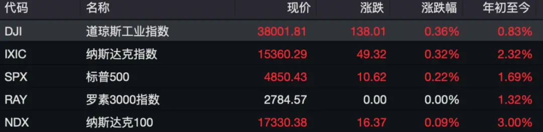 当地时间1月22日,美股三大股指集体收涨,道指与标普500指数再创历史新高,道指首次收在38000点上方。截至收盘,道指涨0.36%,标普500指数涨0.22%,纳指涨0.32%。