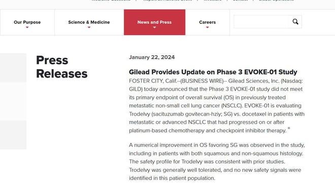 美国医药巨头吉利德周一宣布,其抗癌药物Trodelvy在一项晚期肺癌患者的试验中未能显著改善存活率,导致其股价下跌超过10%。