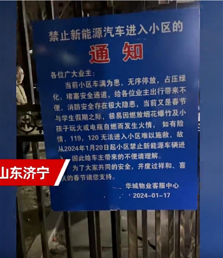 近日,山东济宁某小区发布通知称,从1月20日起严禁新能源车辆进入。当地社区回应称,物业出于消防安全考虑,没法管。