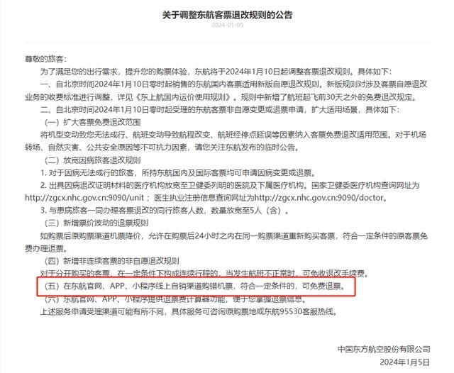 消费者龚先生于1月5日19点13分,下单了这张东方航空公司1月10日20点20分上海→悉尼的机票。巧合的是,东方航空公司于1月5日发出了《关于调整东航客票退改规则的公告》,并规定“在东航官网、APP、小程序线上自销渠道购错机票,符合一定条件的,可免费退票。”但该规则的生效时间是“自北京时间2024年1月10日零时起销售”的机票。