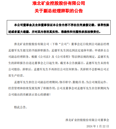 1月21日,淮北矿业发布公告称,董事会近日收到公司副总经理孟德军提交的书面辞职报告,孟德军因达到法定退休年龄,申请辞去公司副总经理职务。根据《公司法》及《公司章程》等法律法规的规定,孟德军的辞职报告自送达董事会之日起生效。