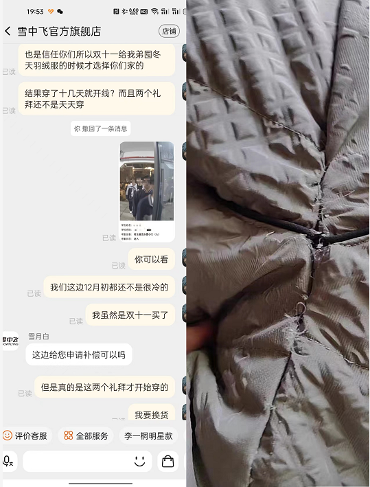 杨女士说,收到货后当时并没有穿,过了大约一个月,到了2023年12月10号左右因为天气降温才把羽绒服拿出来给弟弟穿,但只穿了十天左右,就出现了羽绒服“爆线”“跑绒”的情况,然后羽绒服就开始往外“跑绒”。对于出现的质量问题,她随即联系到雪中飞客服并提出了退换的要求,但客服以过了退换时效为由拒绝了杨女士的要求,只承诺给20元当作补偿。