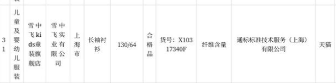 记者注意到,在2023年4月份,国家市场监督管理总局通报2022年羽绒服装抽查情况时,雪中飞儿童及婴幼儿服装因为纤维含量不合格被通报。