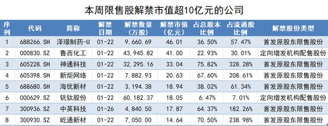 其中,解禁市值超过10亿元的公司有8家,前三分别为泽璟制药-U(688266.SH)、鲁西化工(000830.SZ)、神通科技(605228.SH),均超过30亿元。