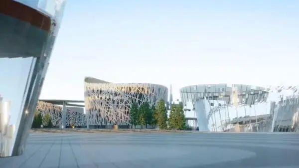 图为与中国北京鸟巢十分相似的建筑设计,截图自韩国釜山2030年世博会园区规划方案宣传片