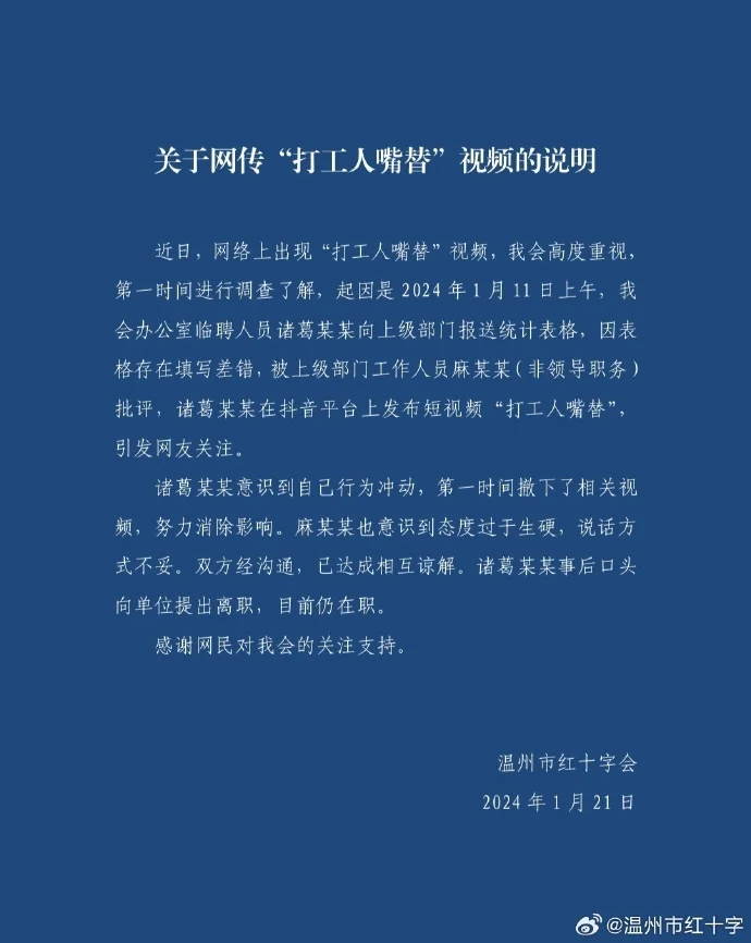 近日,温州市红十字回应网络上出现“打工人嘴替”视频称:我会高度重视,第一时间进行调查了解,起因是 2024 年1月11 日上午,我会办公室临聘人员诸葛某某向上级部门报送统计表格,因表格存在填写差错,被上级部门工作人员麻某某( 非领导职务 )批评,诸葛某某在抖音平台上发布短视频“打工人嘴替”引发网友关注。