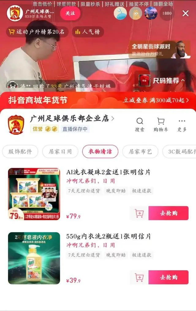 有救队心切的球迷说:“能不能卖一些生活用品,反正都要买的东西,不如就在这里买。”可能是球迷的呼吁被看到,21时48分,附赠球队明信片的洗衣凝珠和洗洁精真的出现在广州队直播间的购物橱窗中,上架后同样瞬间被抢空。