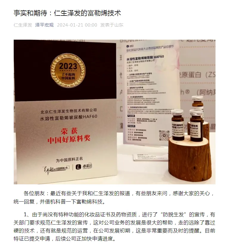 1月21日凌晨,任泽平通过微信公众号“泽平宏观”发文称:“由于尚没有特种功能的化妆品证书及药物资质,进行了‘防脱生发’的宣传,有关部门要求规范仁生泽发的宣传。”
