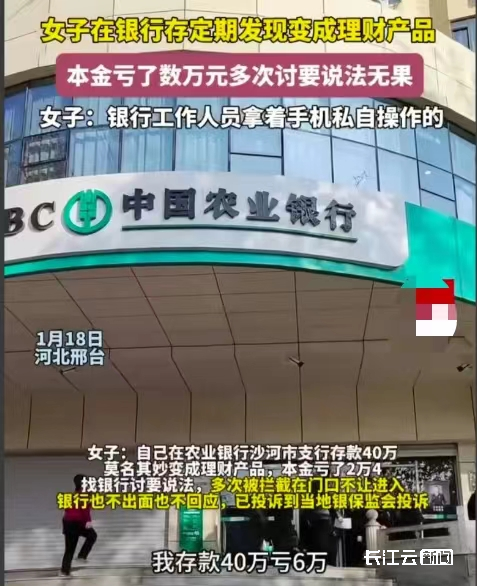 1月19日,网上一则女子银行“定期存款”变“理财产品”亏损2万4成为热搜新闻。视频中显示,女子在农业银行沙河市支行存入40万元定期存款,却发现被银行工作人员私自操作变成了理财产品,导致本金亏损了2万4千元。该女子多次向银行讨要说法,却遭到了银行的拦截和拒绝回应。