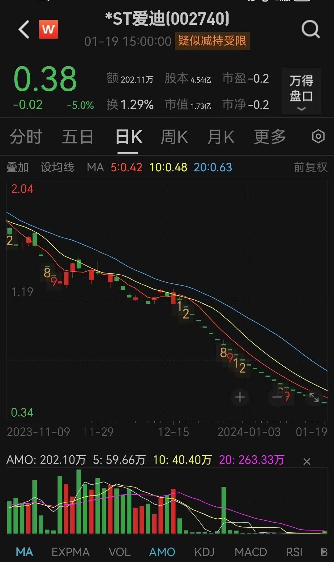 截至1月19日,*ST爱迪收报0.38元/股,下跌5%。2023年12月18日以来,公司股价连续24个交易日跌停,最新市值仅1.73亿元。