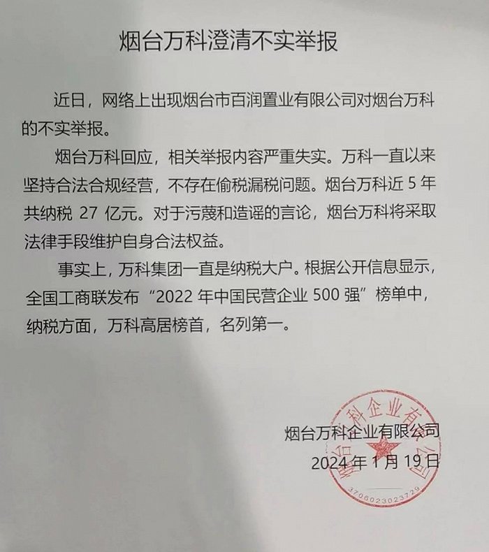 针对万科在山东烟台相关项目被举报逃税一事,根据中证网报道,烟台万科在1月20日回应称,相关举报内容严重失实。