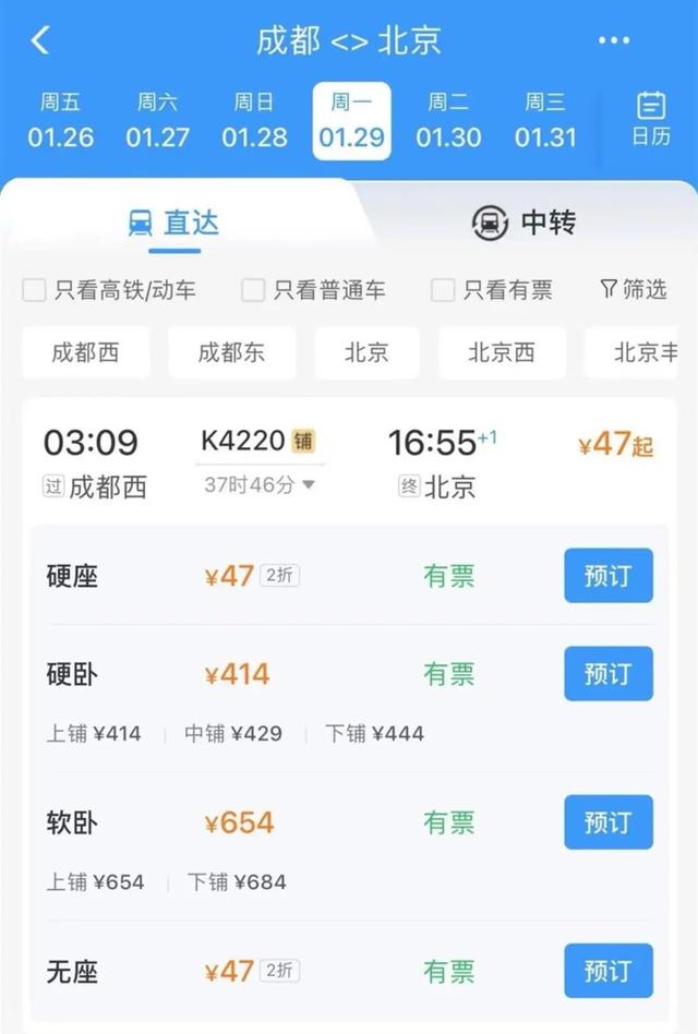 1月17日晚,有多名网友晒出购票软件截图称,1月29日,成都西开往北京的硬座票打两折,只售47元。极目新闻记者注意到,这趟列车车次为K4220,始发站为眉山站,终点站为北京站,全程37小时46分。该趟车的硬座票为47元,但硬卧和软卧票不打折,硬卧上铺票价格为414元,软卧上铺票售654元。其他从成都西站开往北京站的普快列车没有出现折扣票,硬座价格为236元,硬卧上铺价格为399元,软卧上铺价格为629元。有知情人士分析称,K4220次列车为春运期间加开的列车,系从北京到成都西的K4219次列车的反向回空列车,因此才出现大幅折扣。