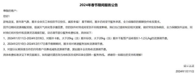 顺丰1月11日发布公告称,春节期间,顺丰将全力保障假期快件收发需求。因节日期间资源调配受限、极端天气变化等多重因素,快件时效或将受到不同程度影响,将对快件和资源灵活调度匹配,动态调节部分服务收费标准,具体如下:一是2024年1月11日至2月9日,对顺丰卡航、大于20kg(含)顺丰标快、大于2020kg(含)顺丰干配等产品收取0.1-1.2元/kg的资源调节费。二是2024年2月10日至2月17日春节假期期间,顺丰将对寄递服务加收资源调节费(部分长期深度合作的月结客户除外)。