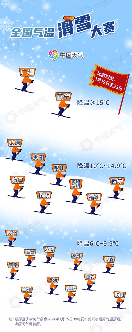 1月20日至23日,今年首场寒潮天气将席卷我国中东部,降温波及超25个省区市,北方多地上演冷暖大逆转,南方将遭湿冷暴击。一场竞争激烈的气温滑雪大赛正式拉开帷幕,此次大赛选手遍布南北,赛期维持近一周,广州、南宁等来自华南的选手实力不俗,气温降幅可超15℃,建议小伙伴们及时翻出最厚衣物,以免“冻哭”。