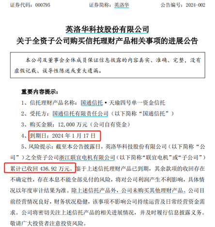 1.2亿元只收回436.92万元,英洛华此前踩雷的理财产品该怎么办?