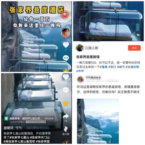 近日,某短视频平台出现了多条有关张家界旅游的视频,视频是一张静态图:几张由玻璃罩着的床,整齐地排列在悬崖上,虽然视频的文案各有不同,但其主要内容都是:“张家界悬崖旅馆”以及房费为“一个晚上500元”。