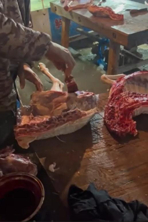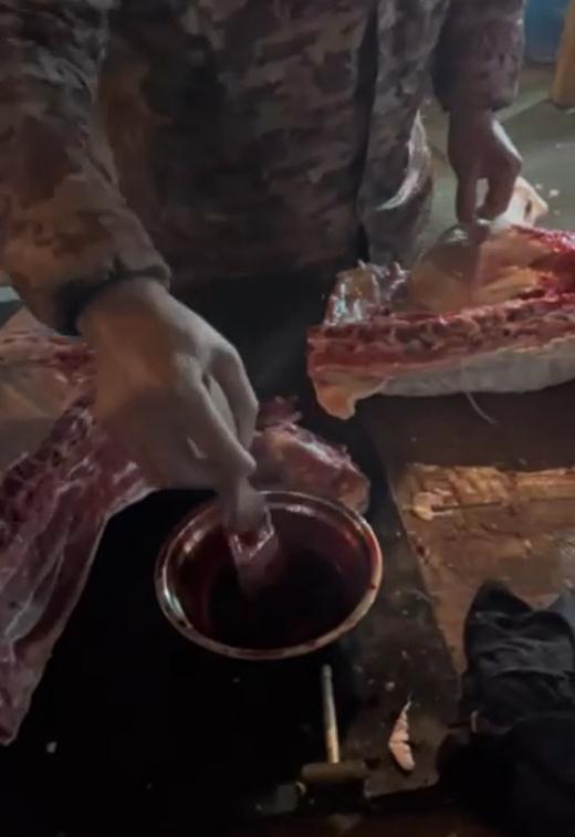 据该网友发布视频显示,有两人正在用刷子给案板上的肉涂抹一种红色液体,疑似为色素血,让冷冻肉看起来更新鲜,据视频发布者表示都是冰冻羊肉,他们给羊肉上了色卖到各大菜市场。