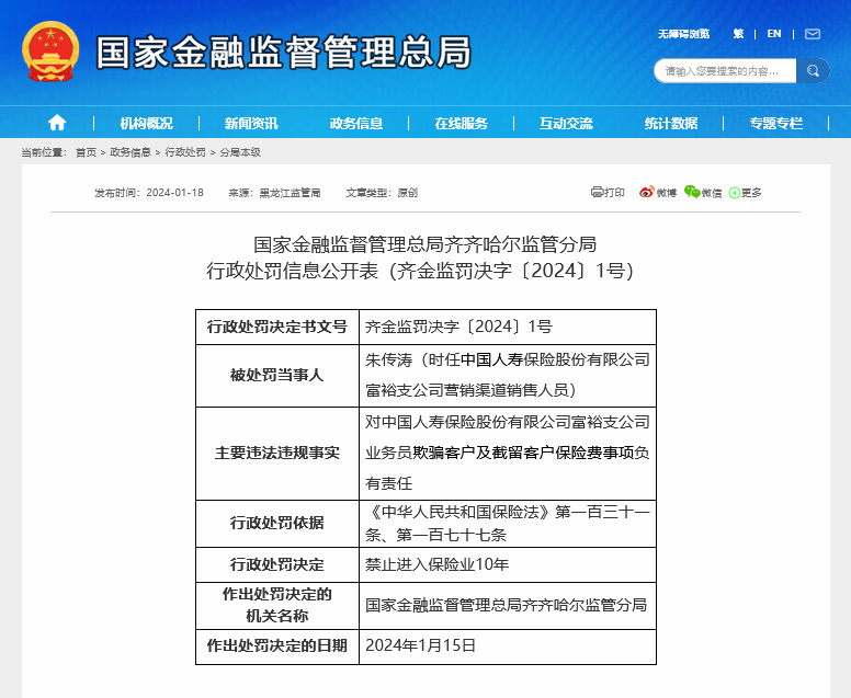 1月17日,国家金融监督管理总局官网发布信息,时任中国人寿保险股份有限公司富裕支公司营销渠道销售人员朱传涛,因为对该公司业务员欺骗客户及截留客户保险费事项负有责任,被监管部门予以禁止进入保险业10年的行政处罚。