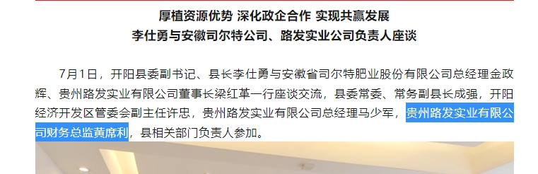 财联社记者查阅公开资料发现,2020年7月1日,司尔特总经理金政辉等人在开阳县就政企合作进行座谈交流时,出现过“黄席利”的身影,但彼时其身份为“贵州路发实业有限公司财务总监”。