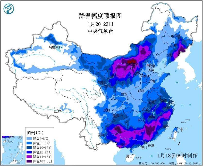 中央气象台预计,受这股寒潮影响,20日至23日,我国中东部地区气温将下降6至10℃,并伴有4至5级偏北风,其中,内蒙古中部、陕西北部、华北西部、吉林东部、辽宁东部、江南东部和南部、华南北部、贵州南部等地气温将下降12至14℃,局地降温幅度超过14℃以上,23日前后最低气温0℃线将南压至华南北部一带。