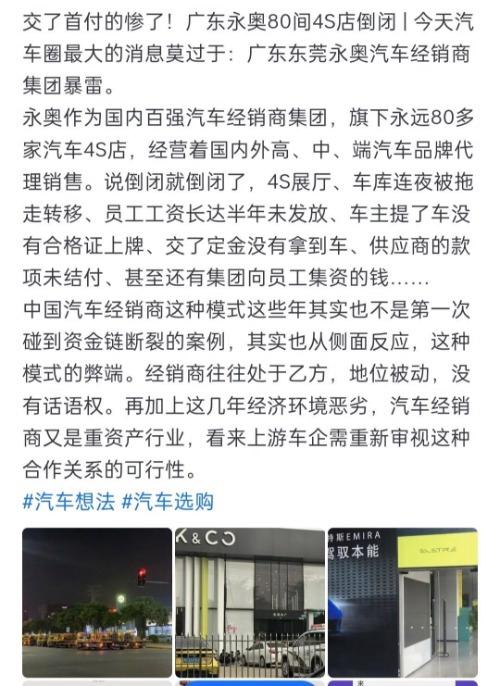 1月17日晚,有网民在社交媒体平台上发布视频并配文称:“现在买车也烂尾了吗?永奥集团名下的东莞寮步店问界交付中心听说已经倒闭了,甚至连展厅的车连夜都拖走了!但是那些交了钱,没提车的怎么办?”这条视频引起热议。