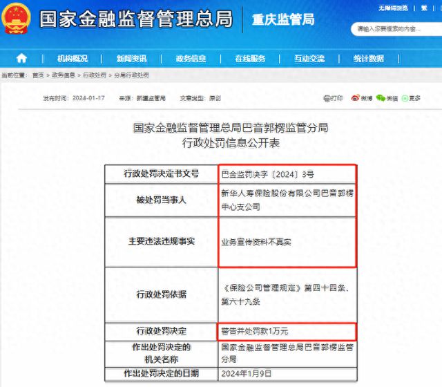 2024年1月17日,国家金融监督管理总局巴音郭楞监管分局公开披露了对新华人寿保险股份有限公司巴音郭楞中心支公司的行政处罚。