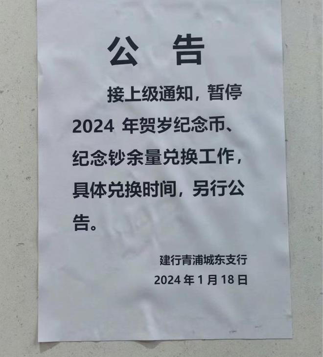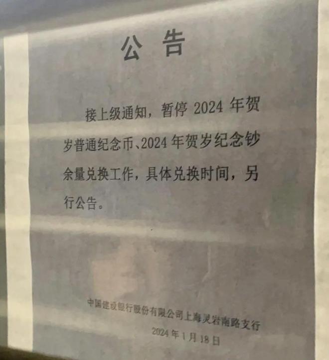 1月18日凌晨,不少集币爱好者发现发行贺岁纪念币、纪念钞的银行网点门口纷纷张贴起了“暂停余量兑换工作”的通知。