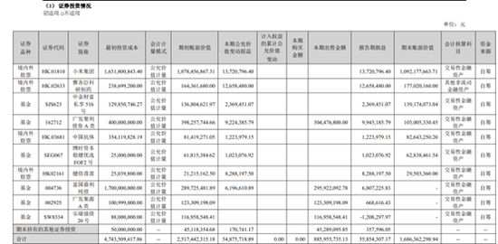 结合公司2023年中报披露的证券投资情况明细看,在“清空”小米集团股票和部分基金投资后,公司仅持有少量基金投资等。截至去年9月末的2.87亿元交易性金融资产余额相比于2020年年末“峰值”时的121.92亿元,减少了近110亿元。